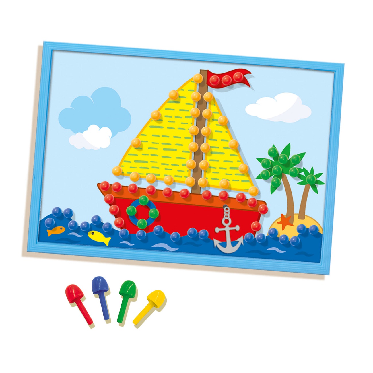 Zestaw zawiera: tablicę do układania mozaik, kolorowe pinezki, 4 karty z kolorowymi wzorami