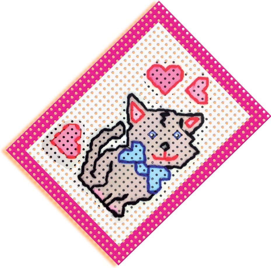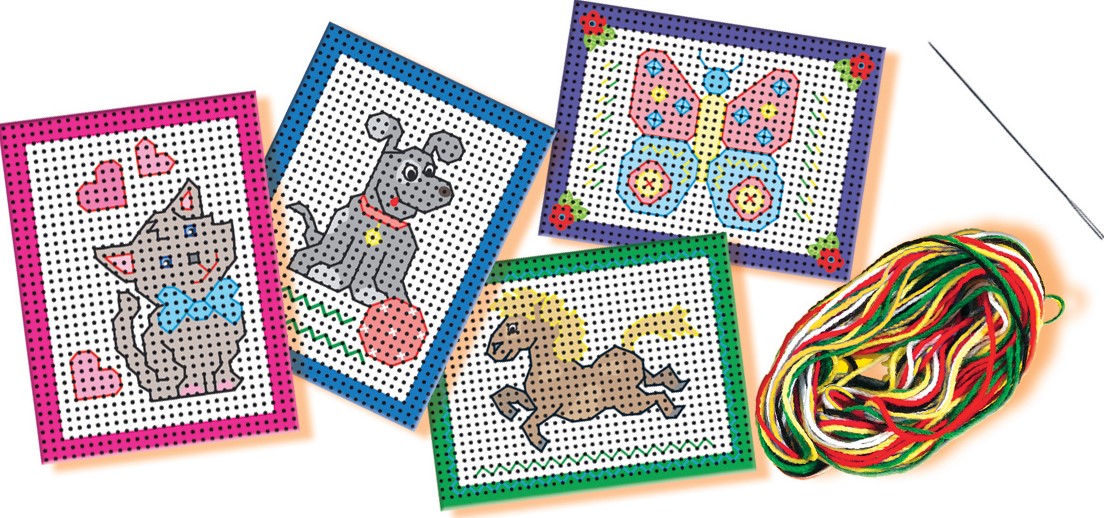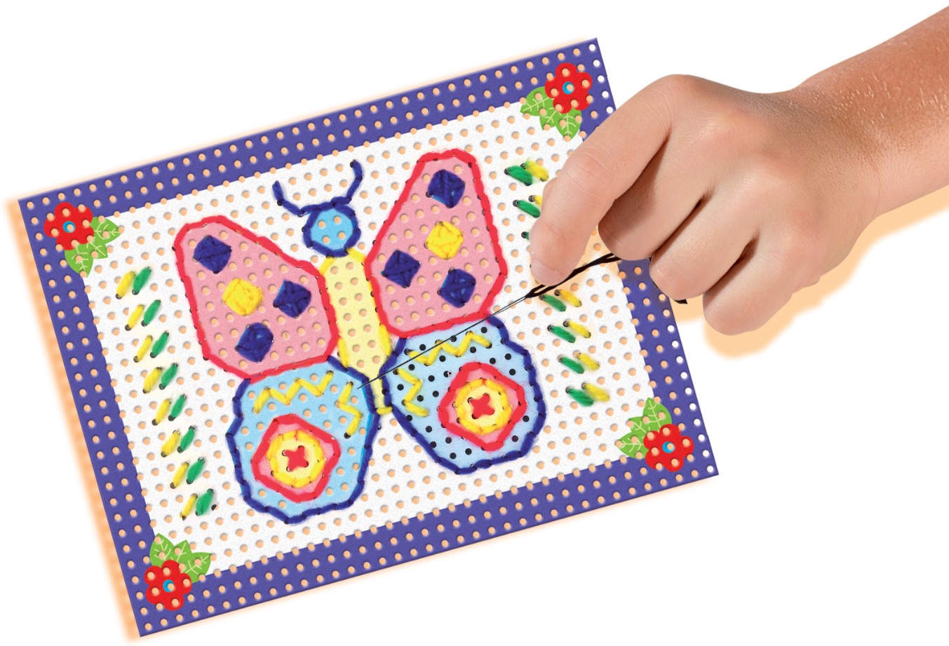 Naucz się używać igły i nici z tym zestawem "Uczę się haftować". Na dołączonych kartach do haftowania można tworzyć zabawne i kolorowe figury. Wyhaftuj kota, motyla, konia i psa. Karty są wstępnie zadrukowane i perforowane, dzięki czemu haftowanie jest łatwiejsze, a igłę można bezpiecznie przewlec przez otwory.