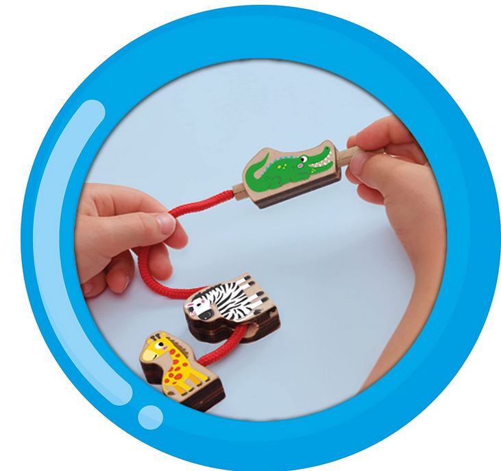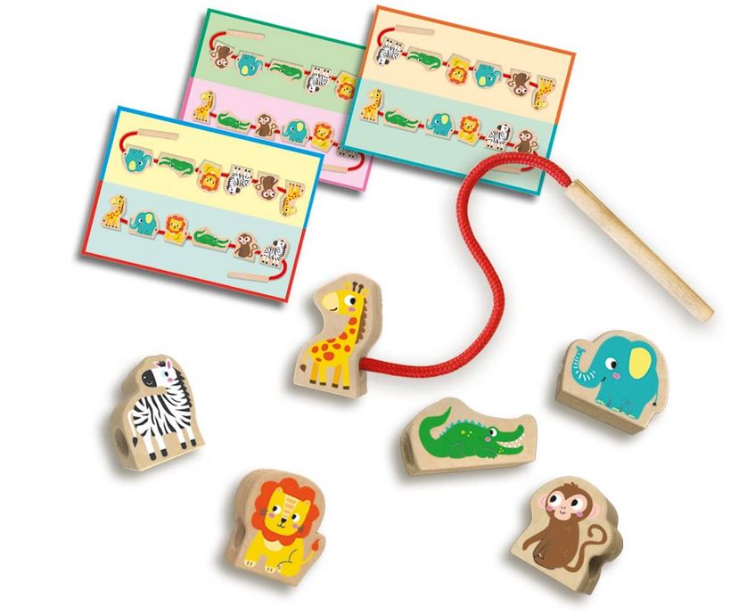 Zabawa w nawlekanie zwierzątek dla najmłodszych będzie ciekawą zabawą. Duża żyrafa jest na stałe przymocowana do sznurka i zawsze tworzy koniec łańcuszka, dzięki czemu inne drewniane koraliki ze zwierzętami nie ślizgają się. Ale które zwierzę jest następne? Silny słoń czy zabawna małpa? Po prostu spójrz na przykładowe karty i nawlecz drewniane zwierzęta w odpowiedniej kolejności. Dzięki grubej, bezpiecznej dla dzieci drewnianej igle nawlekanie jest błyskawiczne, a wszystkie zwierzątka są na solidnym, czerwonym sznurku. Ten zestaw wwzmacnia koordynację ręka-oko i umiejętności motoryczne oraz poszerzy kreatywność dziecka.