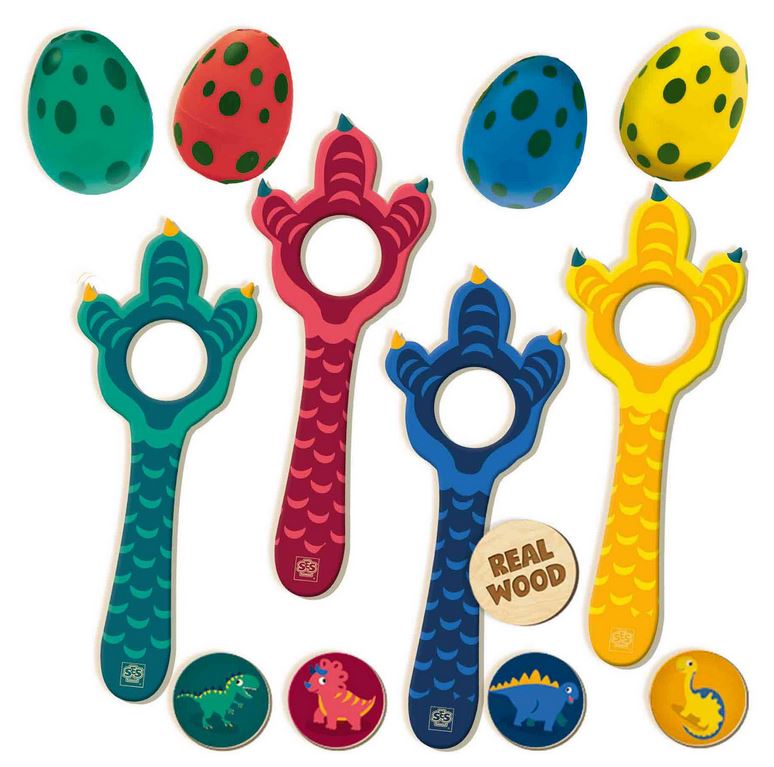Wyścig jaj dinozaurów, ekscytująca i aktywna gra na świeżym powietrzu od SES Creative. Stwórz tor na świeżym powietrzu, a czworo dzieci będzie mogło się ze sobą ścigać! Połóż jajka na drewnianych łyżkach dinozaurów, utrzymuj równowagę i zacznij biec! Kto pierwszy bezpiecznie dotrze na drugą stronę? Zestaw zawiera wygodną torbę do przechowywania z czterema jajami dinozaurów, czterema żetonami dinozaurów i czterema łyżkami dinozaurów.