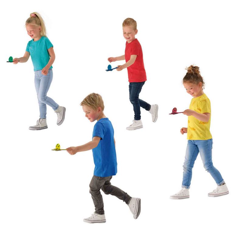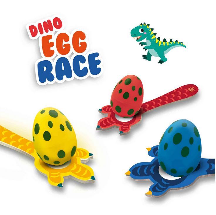 Wyścig jaj dinozaurów, ekscytująca i aktywna gra na świeżym powietrzu od SES Creative. Stwórz tor na świeżym powietrzu, a czworo dzieci będzie mogło się ze sobą ścigać!