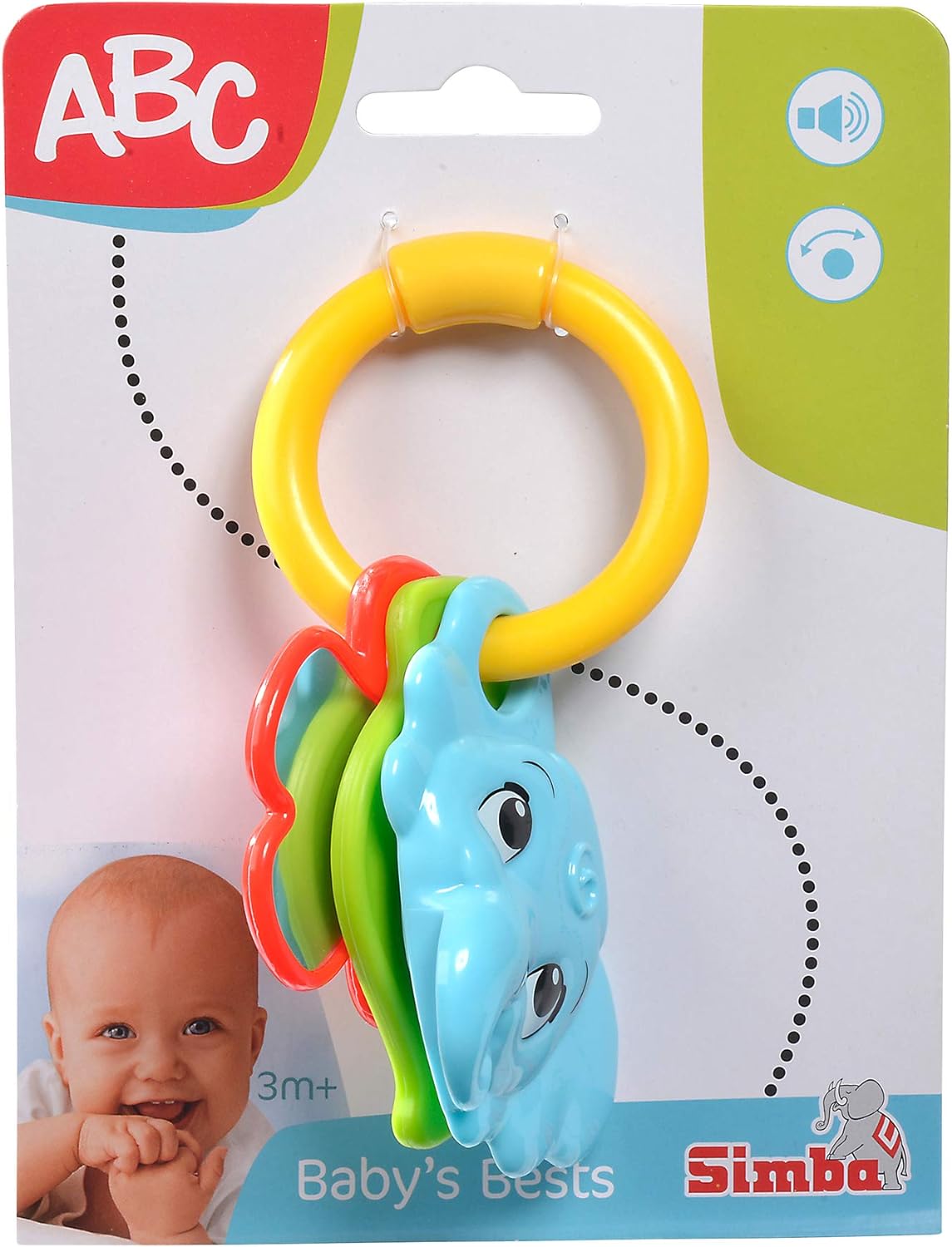 ABC budzi ciekawość niemowląt i małych dzieci w wieku 0-36 miesięcy produktami dostosowanymi do ich wieku i wspiera rozwój w pierwszych latach życia. Pierwsze cele edukacyjne osiąga się poprzez zabawę, odkrywanie kształtów i struktur oraz trenowanie wzorców koordynacji. Grzechotka w kształcie słonia ABC jest łatwa do uchwycenia przez małe dzieci i składa się z trzech elementów. Uroczy słoń ma w środku grzechoczące kulki, więc potrząsanie nim powoduje powstawanie grzechoczących dźwięków, które przyciągną uwagę każdego dziecka. Czerwony kwiatek ma lusterko, a zielony listek służy maluchom jako pomoc stomatologiczna.