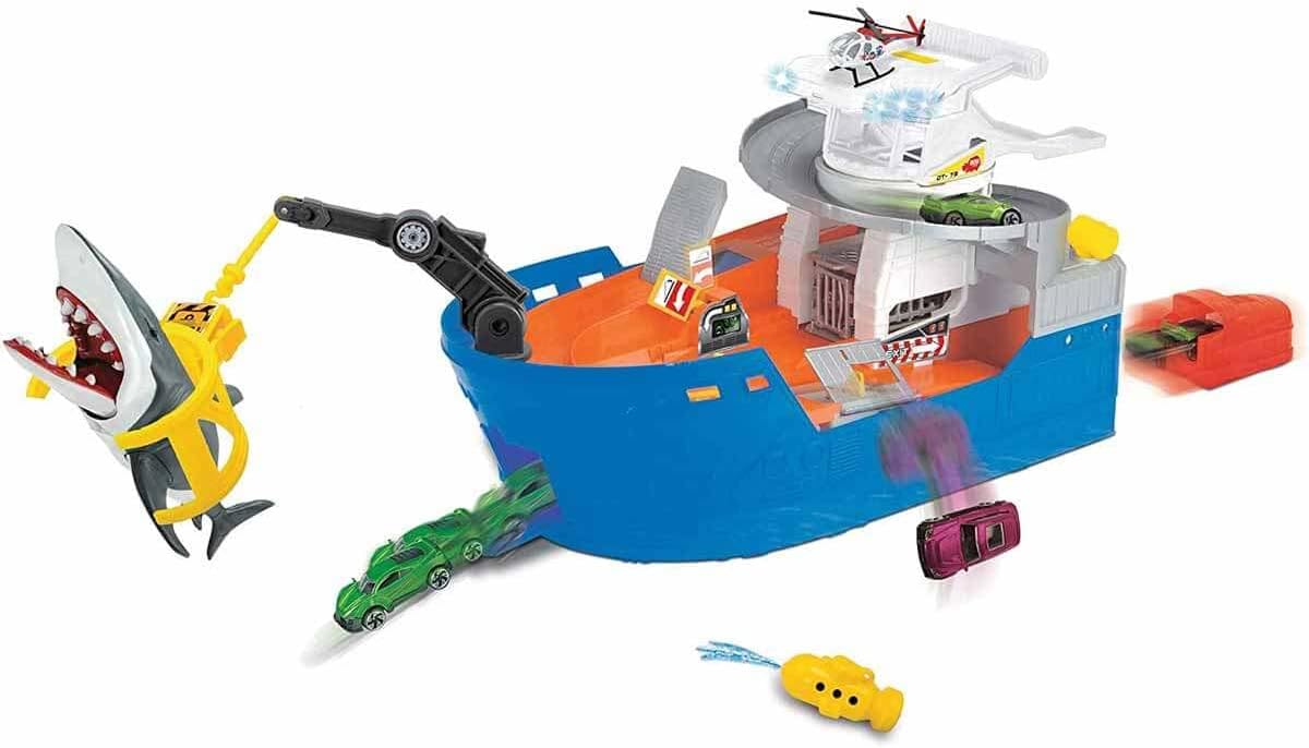 Statek wyposażony w światło i dźwięk, ruchomy dźwig, kapsułę ratunkową, wyrzutnię pojazdu poza burtę statku, trzy możliwe wyjazdy ze statku, metalowy samochód, helikopter, gumowa łódź podwodną oraz rekina z ruchomą szczęką, otwieraną klatkę, statek i kapsuła unoszą się na wodzie dzięki zamontowanemu styropianowi, baterie 2 x 1,5 V R03 w zestawie.