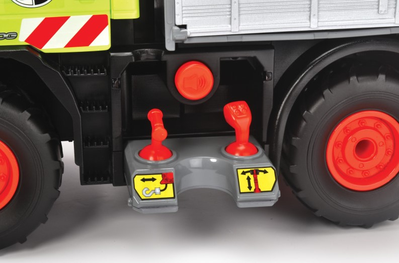 Zabawkowa ciężarówka została wyposażona w funkcjonalny dźwig z uchwytem do przenoszenia ładunków, takich jak drewniane bale dołączone do zestawu. Dźwig sterowany jest przy pomocy joysticków, co sprawia, że zabawa jest jeszcze bardziej interaktywna i rozwija zdolności manualne dziecka. Z przodu pojazdu znajduje się ruchoma wyciągarka, która dodatkowo wzbogaca scenariusze zabawy.