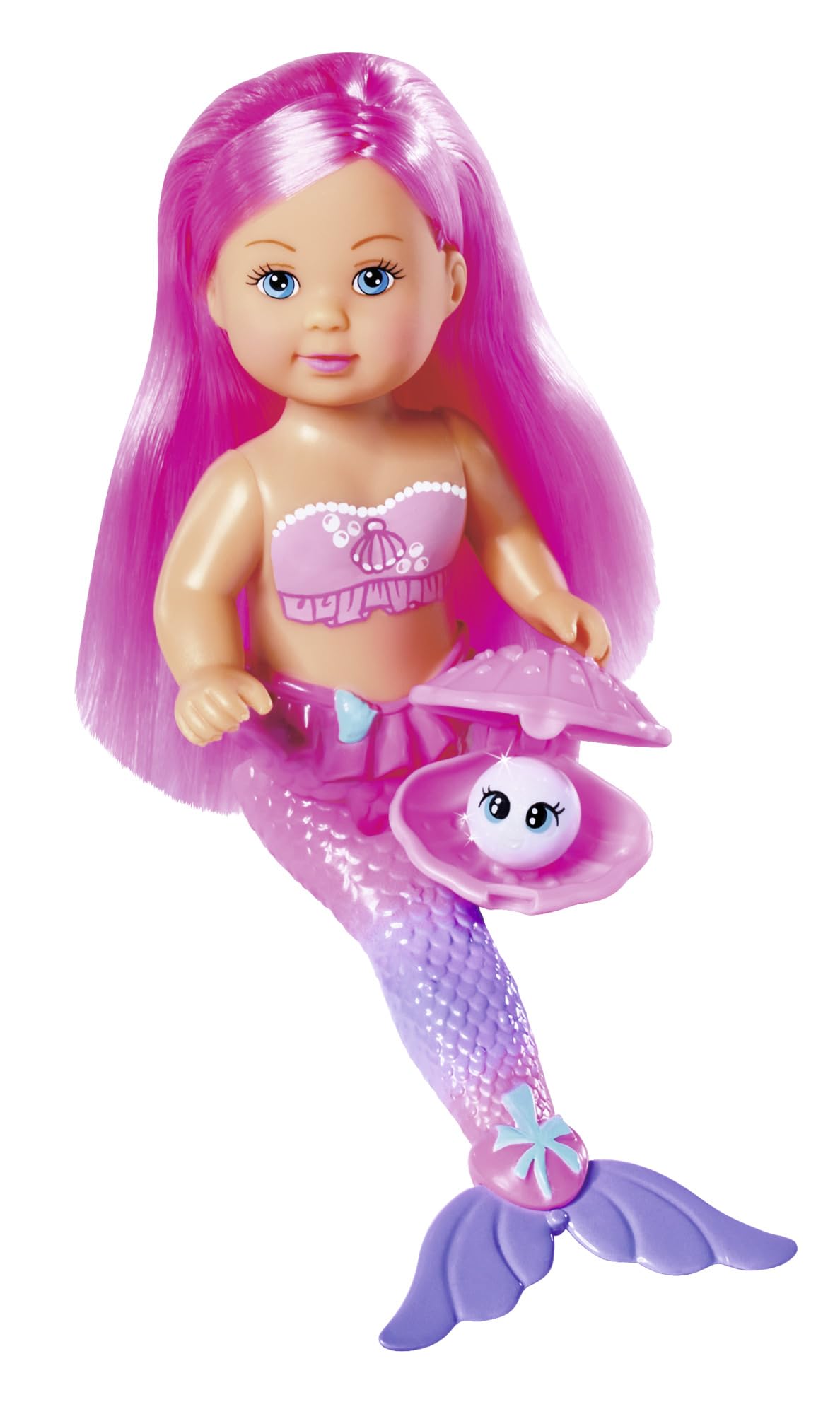 Odkryj magiczny podwodny świat z lalką Evi Love w roli pięknej syrenki! Ta urocza lalka ma długie różowe włosy i syreni ogon, który mieni się kolorami oceanu.