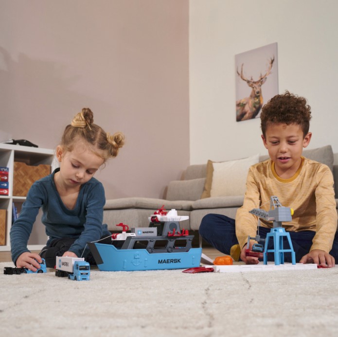 Zestaw Maersk, w skład którego wchodzi łódź, stacja portowa, ruchomy dźwig z platformą ładunkową, 2 łodzie ratownicze, 1 metalowy pojazd oraz 1 kontener. Zestaw posiada mnóstwo ruchomych elementów. Dodatkowo łodzią można bawić się na lądzie jak i w wodzie, gdyż posiada funkcje pływania. Długość łodzi 52 cm, dla dzieci w wieku 5+.