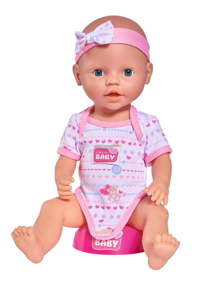 New Born Baby to lalka, którą dziecko może karmić, kąpać, przewijać, jak i zabierać na spacery. Model z akcesoriami został wyposażony w wiele dodatków potrzebnych dziecku do opieki nad jego maleństwem: znajdziemy w nim butelkę, smoczek, kubek niekapek, talerzyk, sztućce (łyżka i widelec), pieluchę oraz nocnik.