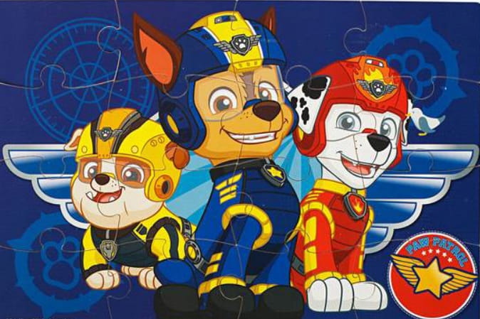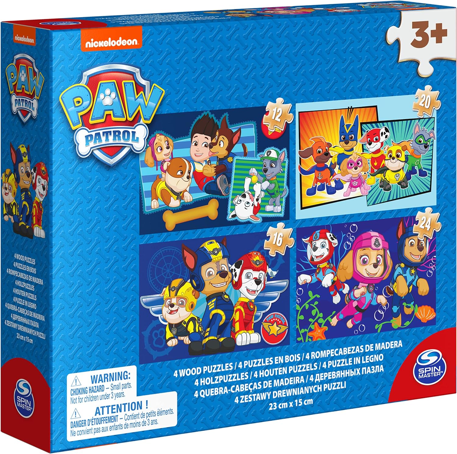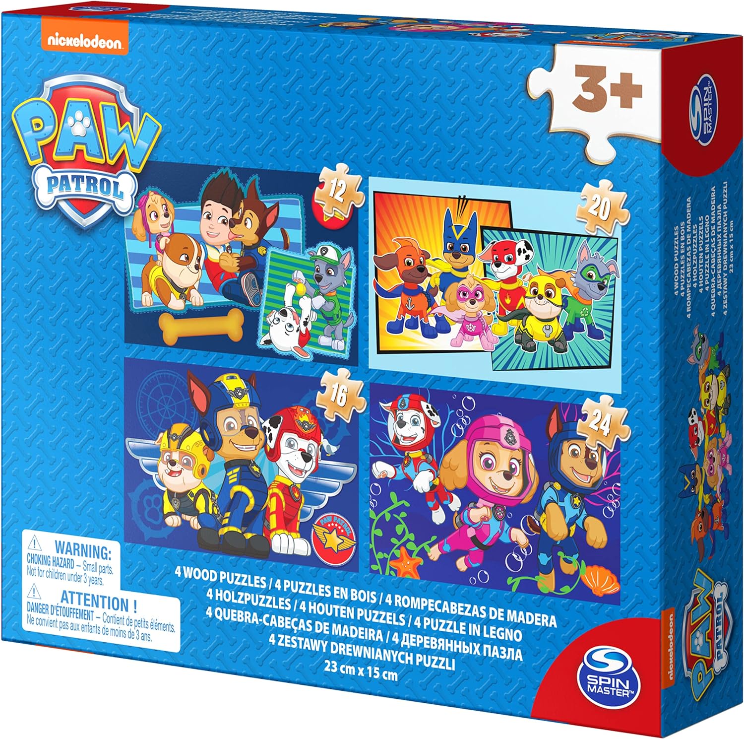 Puzzle drewniane składające się z aż 4 układanek, które przedstawiają ulubionych bohaterów bajki "Psi Patrol".