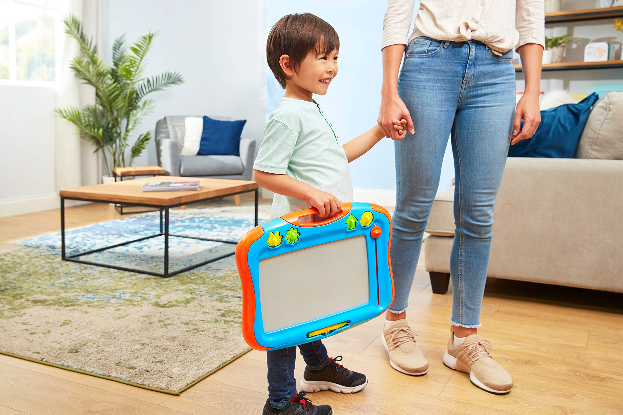 Ta klasyczna tablica-znikopis, w rozmiarze XXL dodatkowo zawiera specjalne stempelki, pozwalające na tworzenie ciekawych wzorów. Jest ich cztery i mają swoje miejsce do przechowywania nad ekranem. Znikopis to kreatywna zabawa bez końca! Magnetyczna tablica służy do rysowania za pomocą specjalnego, dołączonego do zestawu pisaka. Aby wyczyścić "kartkę" wystarczy jedynie przesunąć suwak umieszczony z prawej strony. Dzięki temu zabawę możemy rozpocząć od nowa. Znikopis to świetna zabawa, ale też sposób na naukę i doskonalenie rysowania bez bałaganu i zabrudzeń! Tablica posiada wygodny do przenoszenia uchwyt, dzięki czemu dziecko może ją zabrać gdzie tylko ma ochotę.
