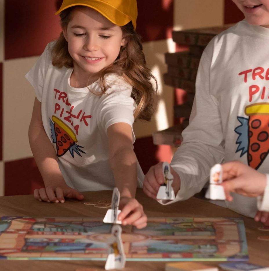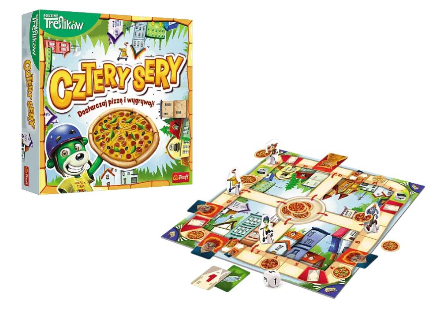 Cztery Sery z Rodziną Treflików to przezabawna gra planszowa, w której wcielisz się w dostawcę pizzy! Poruszaj się po planszy, zagrywaj karty akcji i blokuj przeciwników. Pamiętaj, żeby wrócić po kolejne, nowe zamówienie. Uważaj na karty Ciotki i Kota, którzy już czekają na swoje ulubione przysmaki! Bądź pierwszy, dostarcz zamówione pizze pod wskazane adresy i zostań zwycięzcą!